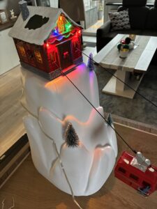 Meine Liebste hatte vor einigen Jahren mal in Eigenregie eine ähnliche Seilbahn in mühevoller und nervenaufreibender Arbeit selbst gebaut- natürlich bewegte sich diese nicht und da die Gondeln aus Pappe angefertigt waren, haben sie auch nur eine Vorweihnachtszeit „überlebt“. Aber somit haben wir uns einen lange gehegten Wunsch erfüllt und freuen uns schon, wenn die Zeit des Dekorierens kommt und die Bahn in Aktion treten wird.