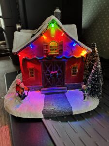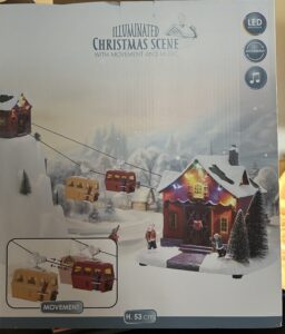 ich habe sie nur mal „auf die Schnelle“ aufgebaut und gecheckt, ob alles funktioniert. Das linke Bild zeigt die Verpackung, in der Mitte die „Talstation“ und rechts auf dem Bild ist die „Bergstation“ zu erkennen. Alles- sogar die beiden Gondeln- ist beleuchtet und wer es nervig mag, darf ein „blechern klingendes“ Weihnachtslied dudeln lassen. Empfehlenswert ist das aber nicht. Zumindest nicht aus unserer Sicht.