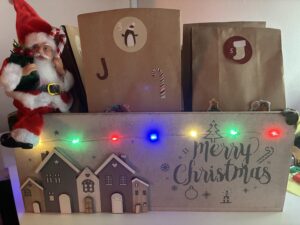In dieser liebevoll gestalteten Kiste (man beachte die angebrachte Lichterkette) gibt es nun jeden Tag bis zum Fest eine Überraschung, mit der ich- ähm- Tomte’s Haus gestalten kann.